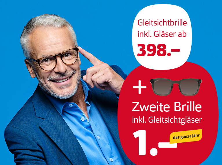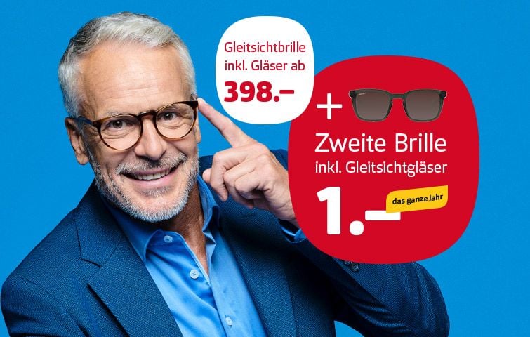 Erhältlich im Onlineshop und den Filialen: Brille inklusive Gläsern für 49.– oder als Gleitsichtbrille für 149.–.
