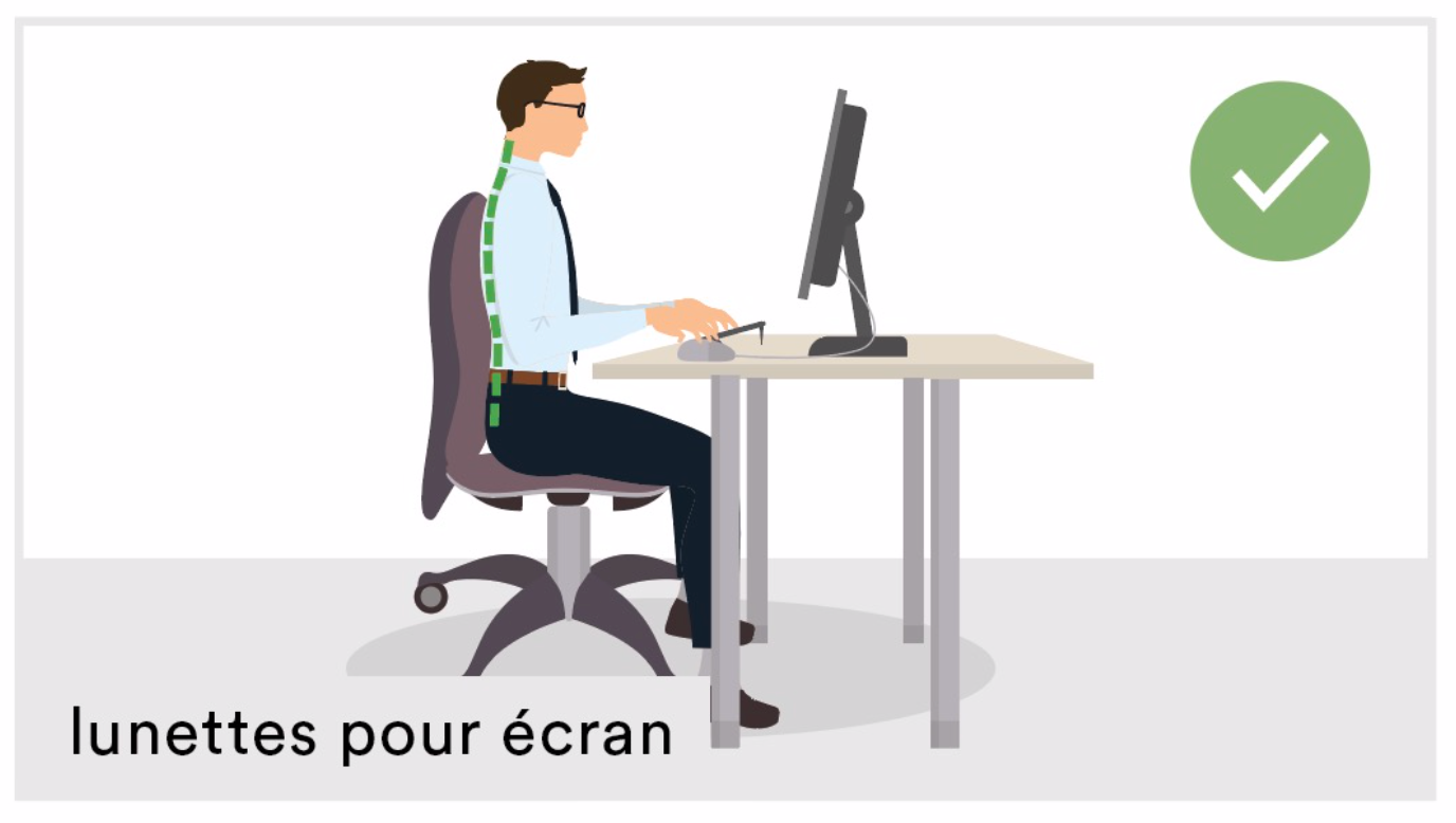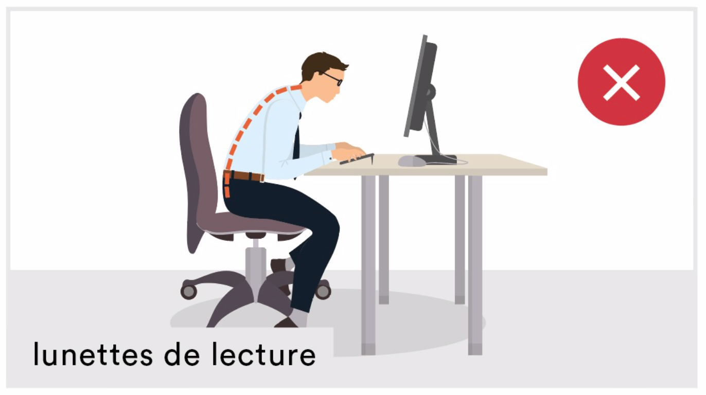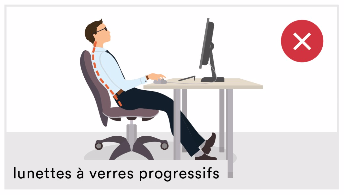 Les lunettes de lecture classiques permettent généralement de bien voir à une distance de lecture normale jusqu’à 40 cm. L’écran, quant à lui, se trouve bien souvent entre 70 et 100 cm de nos yeux. Nous avons alors tendance à nous pencher en avant, ce qui sollicite notre nuque et notre dos. Les lunettes à verres progressifs servent, quant à elles, à voir de loin et de près. Ces deux zones exploitent la plus grande partie du verre. La zone intermédiaire requise pour travailler sur un écran est plutôt limitée. Les porteurs de lunettes à verres progressifs ont donc tendance à positionner la tête en arrière afin d'améliorer leurs perceptions depuis le centre de leurs verres, ce qui crée des tensions musculaires.